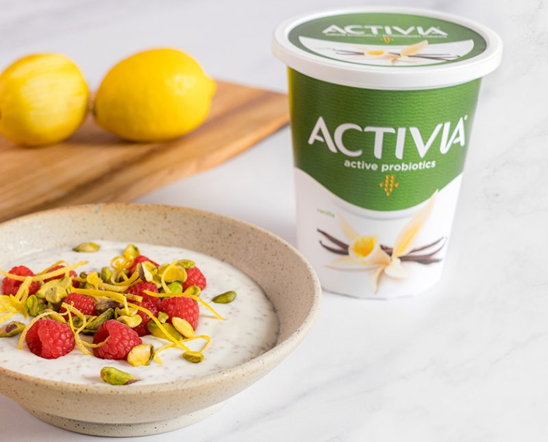 - Verser le mélange de yogourt et de chia dans deux pots. Garnir chacun d’eux de la moitié des framboises, des pistaches et du zeste de citron.