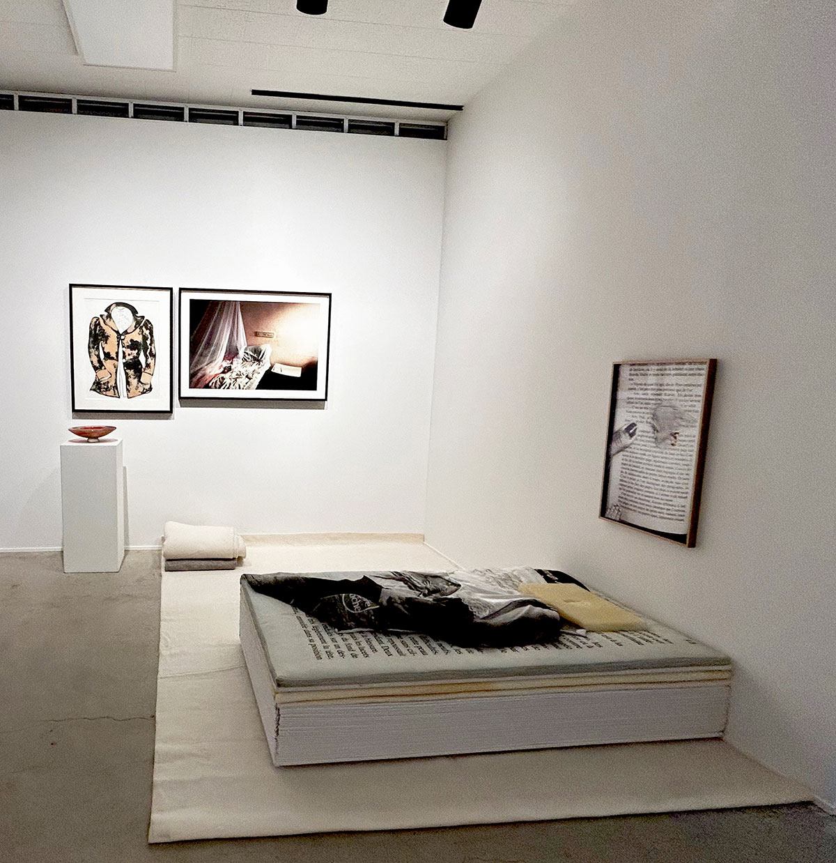 Jouant avec les mots, Cindy Dumais a imaginé une chambre de lecture où elle cite des éléments de plusieurs œuvres de la Collection. Son installation rappelle l’univers noir et blanc de Joe Lima, avec des touches d’or et de rouge, qui évoquent une œuvre de Sylvie Bélanger. Elle a fabriqué un lit à partir du livre qui se trouvait dans une photographie de Pierre Blache et y a déposé un peignoir qui rappelle une œuvre de Deborah Wood.